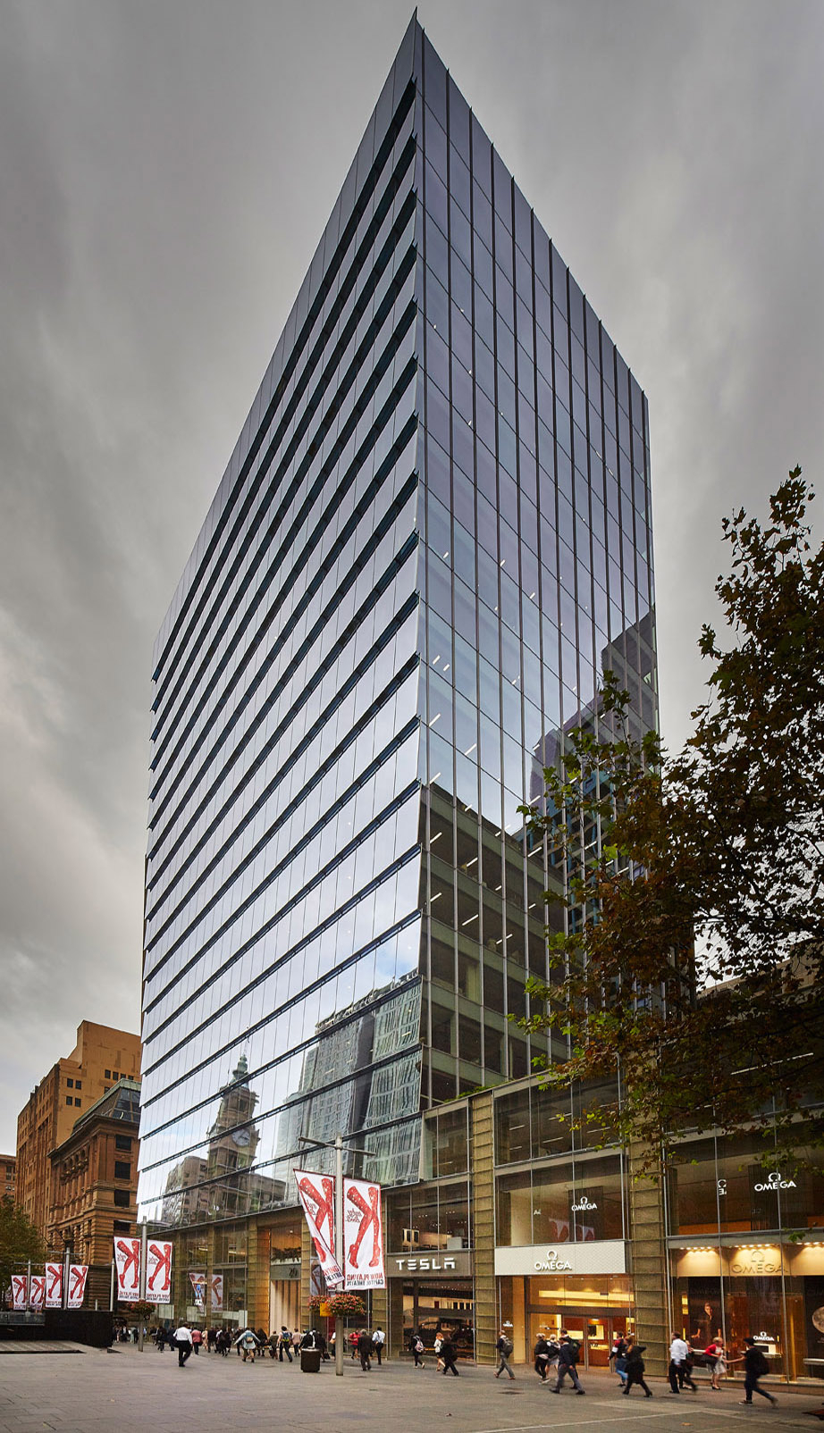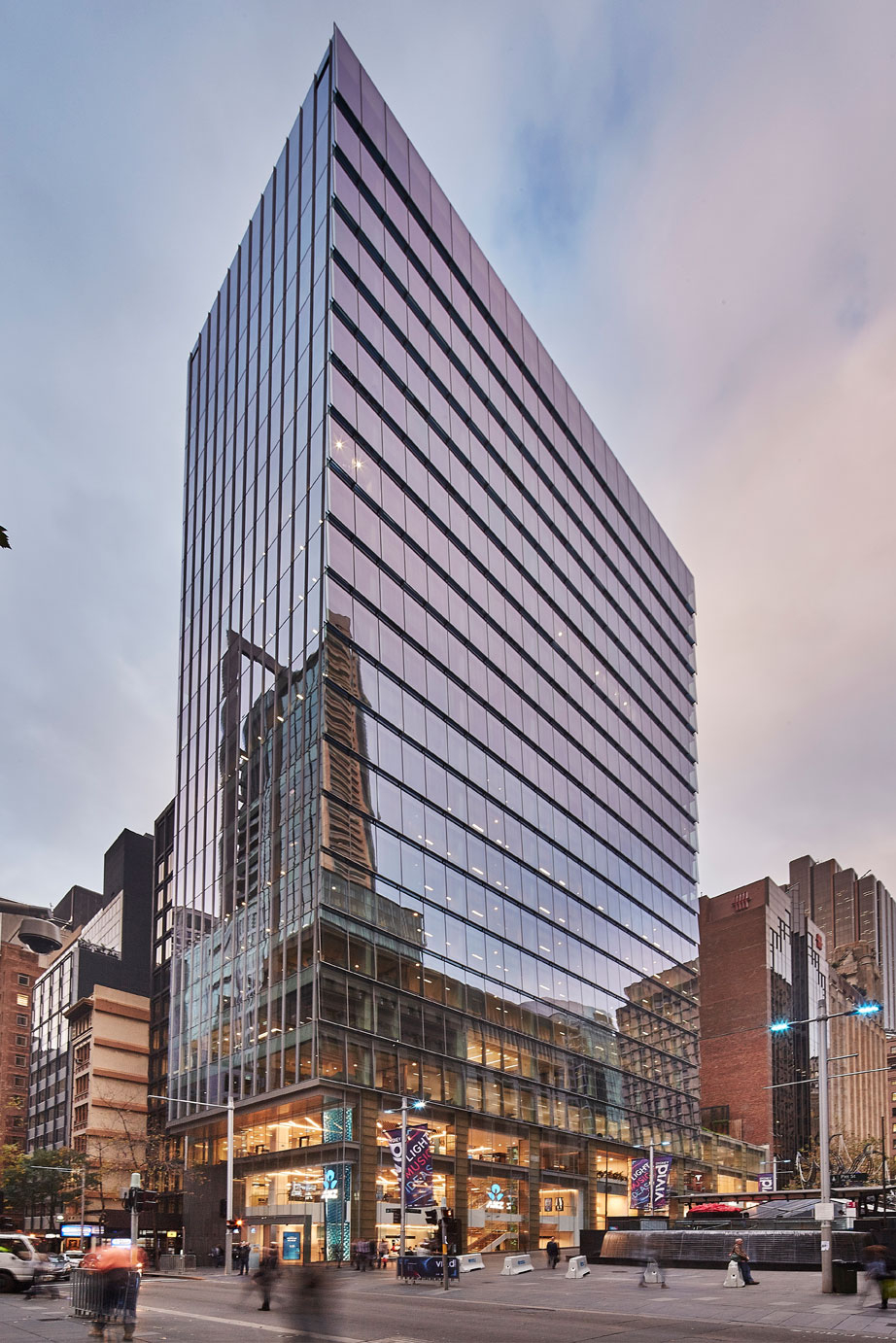 JCDA was the lead design partner re-envisioning the 20 Martin Place tower. As part of this 1970s commercial building’s transformation, only the 20-storey existing steel frame structure was saved and a new core, slabs and enclosure were built, reinvesting the highly technical but understated glass façade with a level of detail and materiality equal to the surrounding historic buildings’ craftsmanship. A new lobby and storefront and curtainwall advances the tower’s integration into the architectural landscape of downtown Sydney, while incorporating a fresh aesthetic that uses glass to create a luminescent presence. An innovative cladding system composed of overlapping rows of glass panels channel and diffuse natural light from the building’s southern façade, creating an iridescent effect that responds to changing light conditions of Sydney’s urban environment.