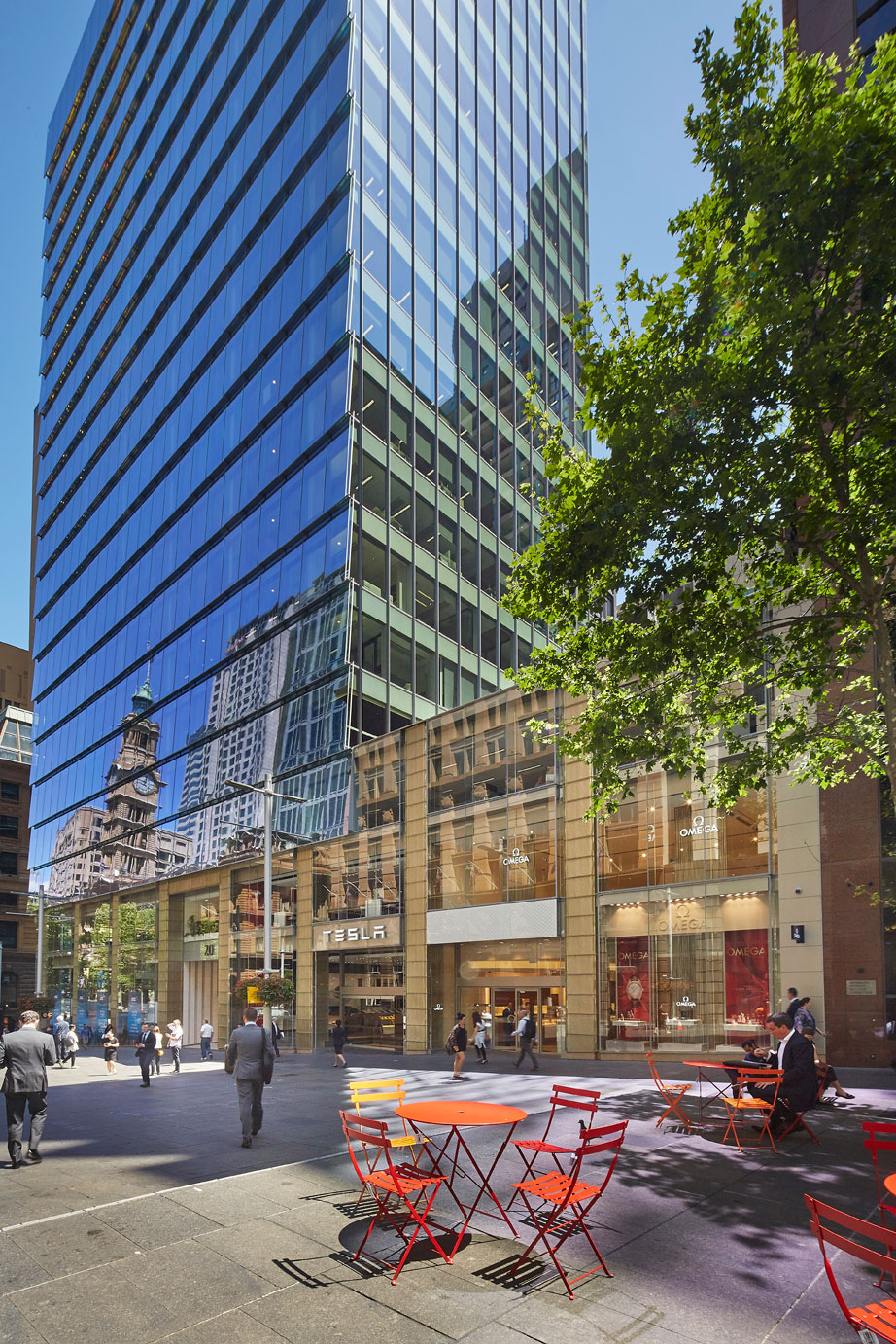 This same thoughtful application of light and glass are evident in the interstitial spaces that connect the tower with the podium at its base, which incorporate glass vitrines and cast glass columns to activate the public realm at street level. The interlocking connection between the tower's shaft and podium draws on Sydney’s historic architectural traditions, while enlivening the space with an infusion of light and materiality. The design activates the podium as a reconfigured civic space that seamlessly enhances both the tower and the surrounding urban landscape.