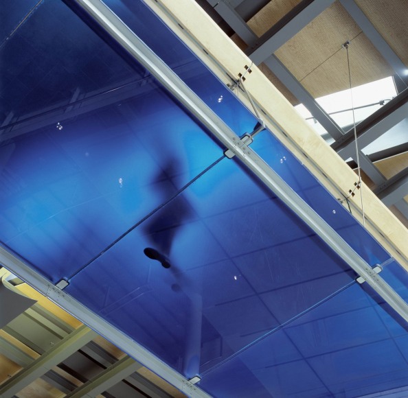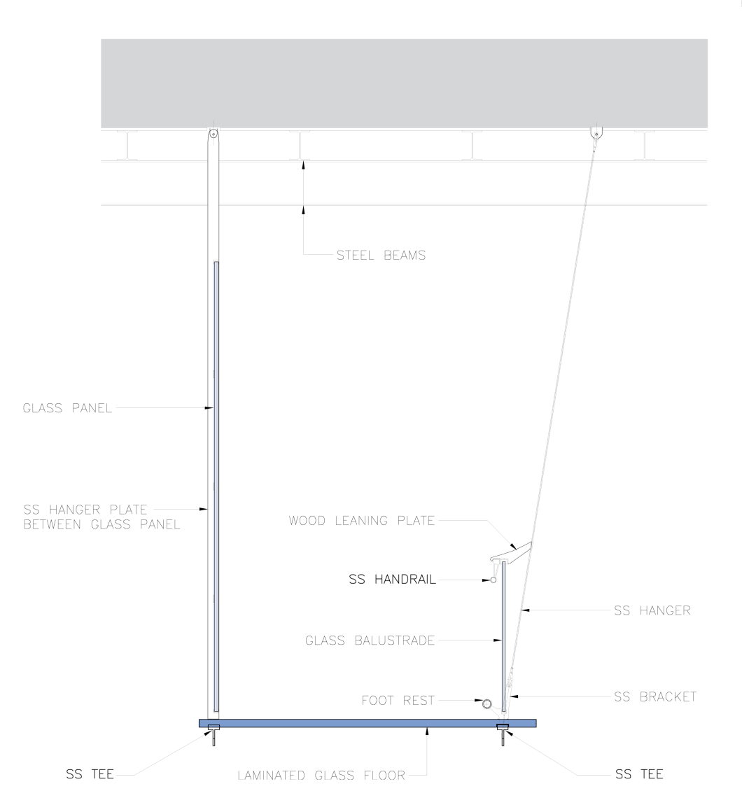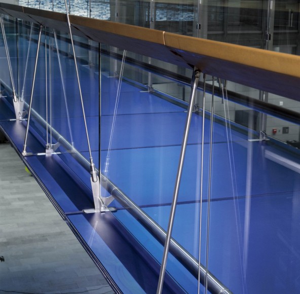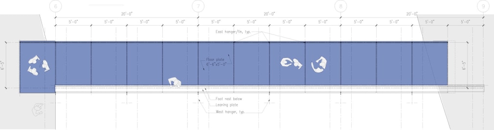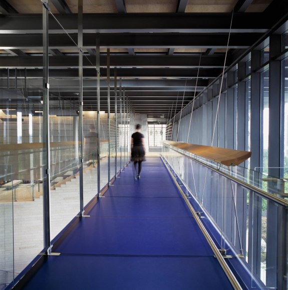 The blue glass floor of the bridge makes a conceptual connection to Puget Sound as a transposed slice of water. The 70-foot-long bridge provides a maple wood leaning rail of generous proportions toward the water, and a transparent glass wall toward the lobby. The leaning rail encourages gathering and discussion while viewing the Sound and distant Olympic mountains.