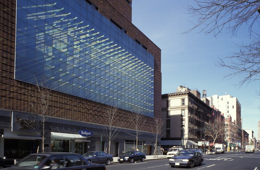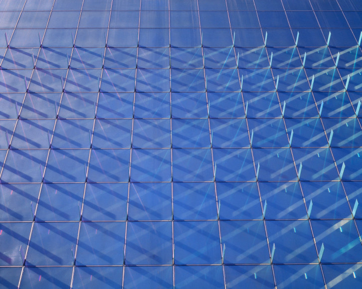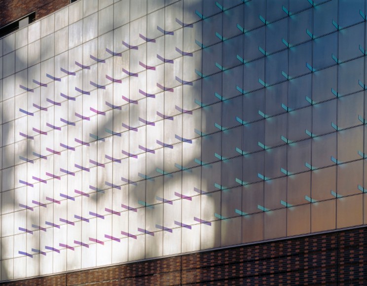 The Dichroic Light Field reactivates a city block, imbuing it with color and light by replacing a blank brick façade with a diffused vertical plane of mirror glass and horizontal coated glass fins. The artwork breaks down the monolithic character of the façade, transforming it into a dynamic illusion of depth. JCDA analyzed the installation’s specific location and contextual topography to create a design that would register those changes and map the local urban fabric.