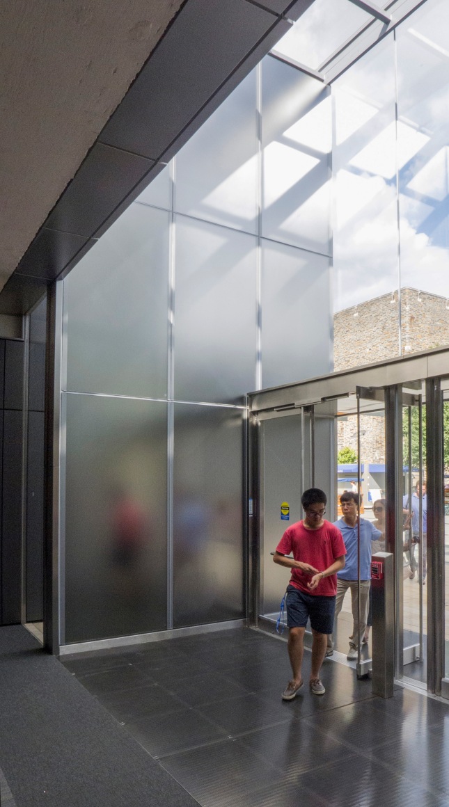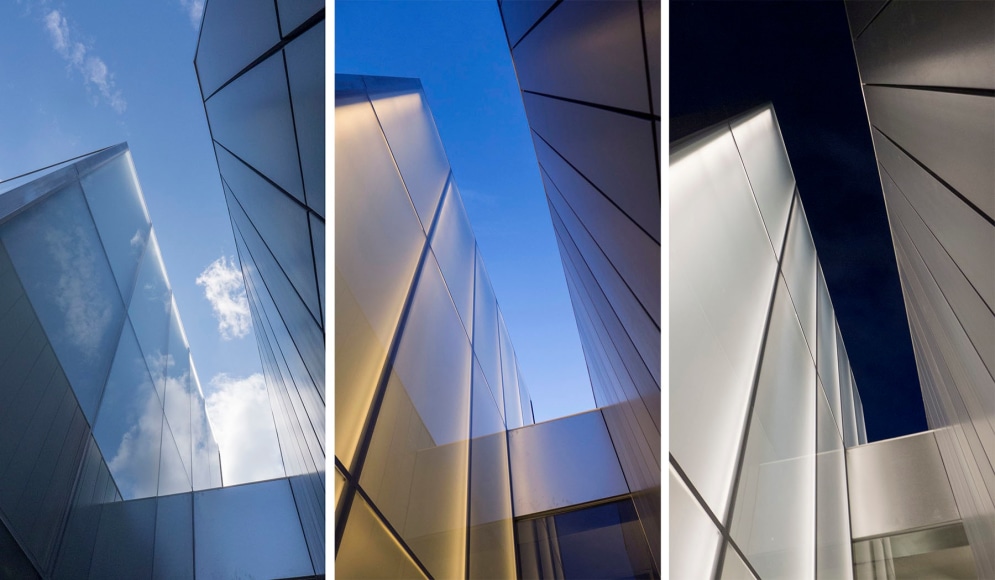 The entry’s ceramic cladding and sidewalls of etched glass and diffused reflective metal mediate the original architecture’s materiality with atmospheric and dynamic reflections of Duke’s natural environment, offering a more generous and memorable experience of entry into the student center.