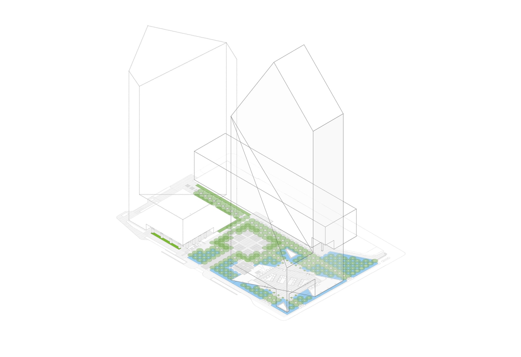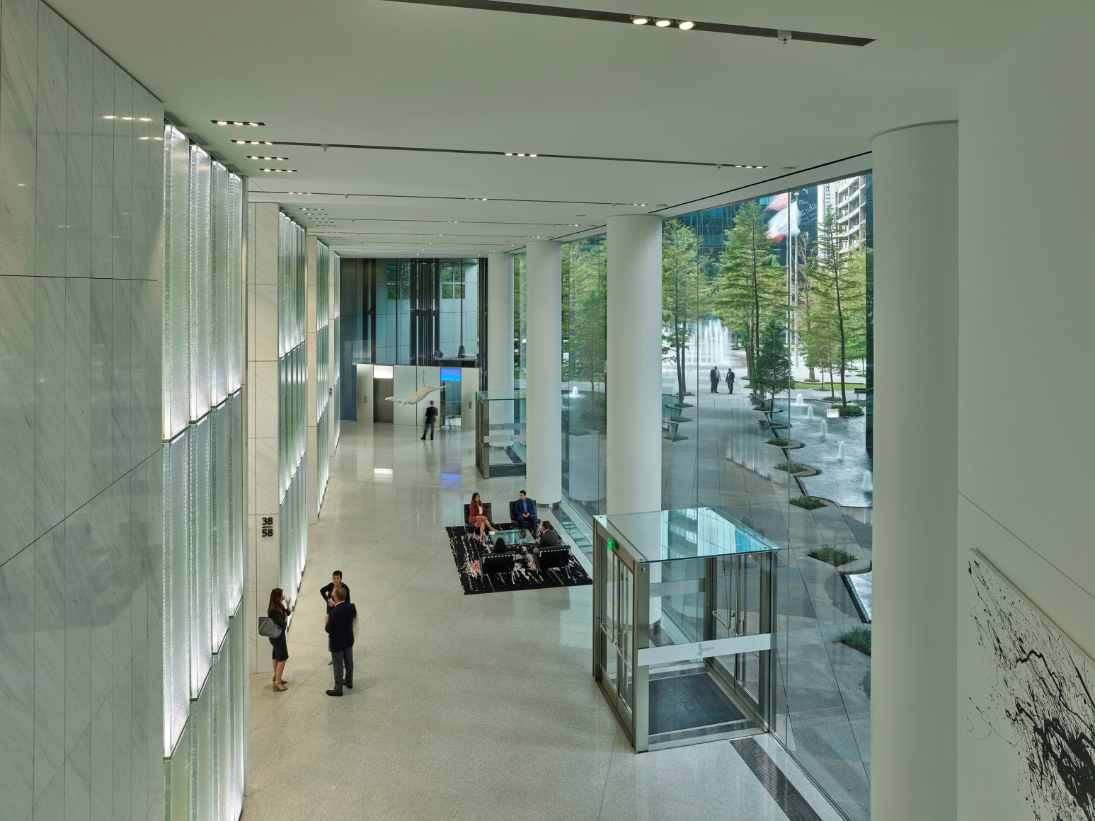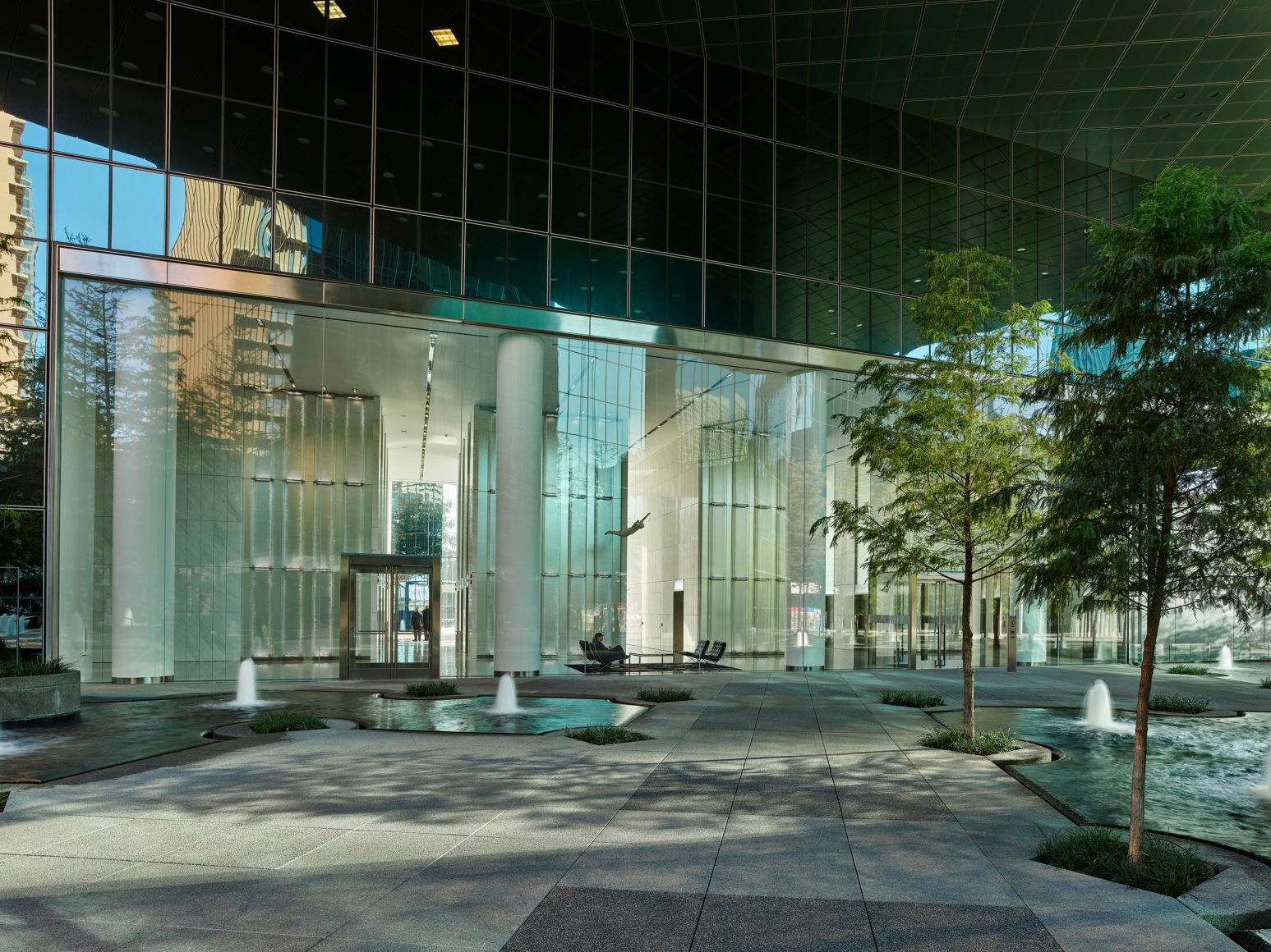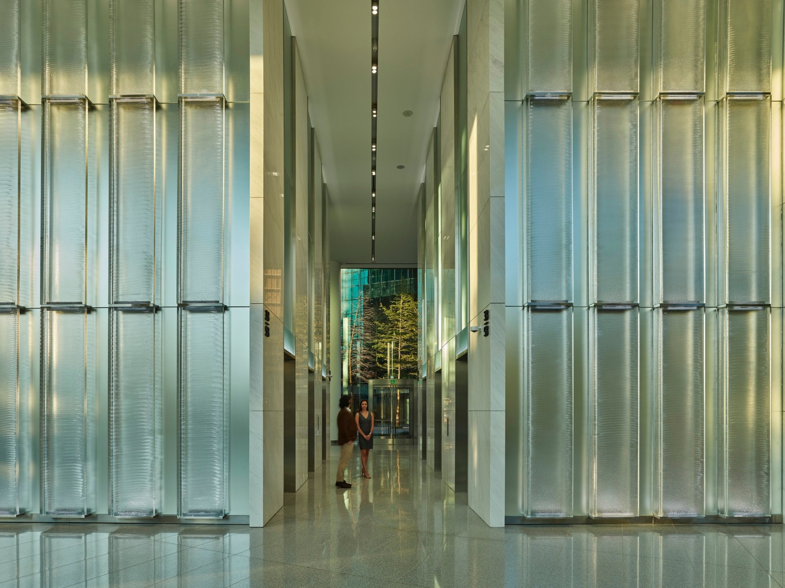 A defining feature of the Office Tower public spaces are the monumental cast glass walls that line the elevator cores facing the Garden. Embodying the fountains, the glass pillars are mounted in front of a diffuse reflective glass wall creating an expanded threshold linking the public spaces of the lobby and gardens.