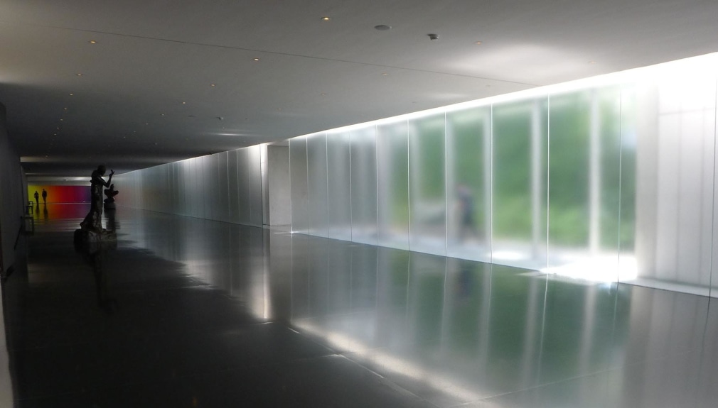 As visitors transition through the Entrance Pavilions at the front of the campus, they may reach the galleries either by ascending the Museum’s refurbished Carter Promenade or by entering the new Route of Passage, situated directly below the promenade. Leading visitors to the heart of the Museum, this below-ground transition is designed as a luminous and active visitor experience. The route is flanked on one side by a light slot revealed behind a continuous translucent glass wall. Enclosing the light slot above is a prismatic cast glass water-feature running along the Carter Promenade’s walkway. Water-activated light projected into the light-slot is distilled by the 426-foot-long translucent glass wall into a mutable expression of the sky sweeping across the campus. The sound of the bubbling water combined with the performative effects of the light create both a visual and aural connection between the below-ground Route of Passage and the gardens above.