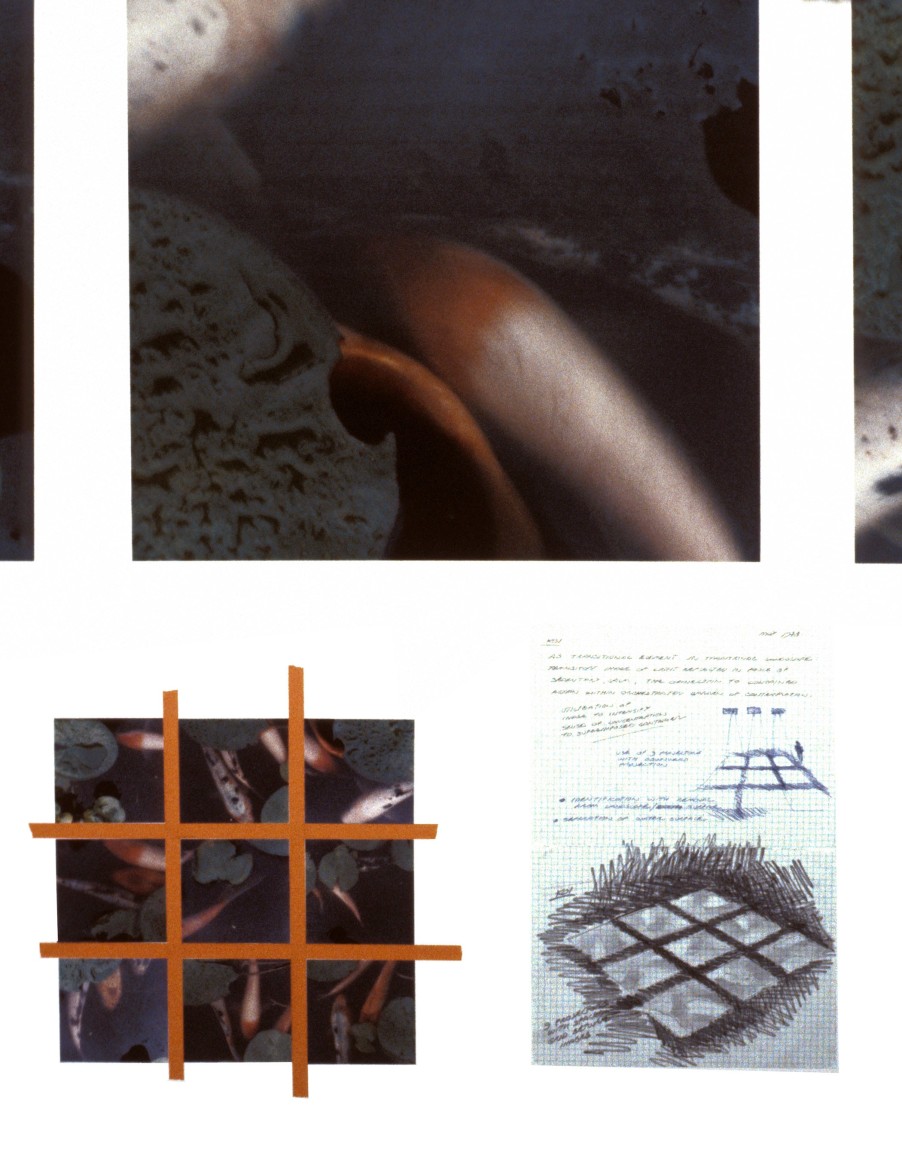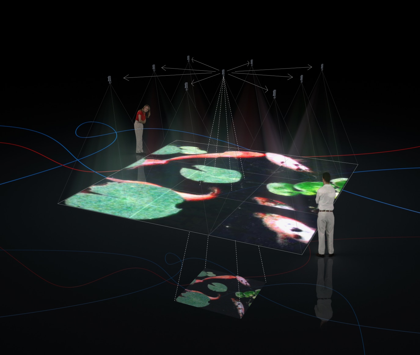 The original footage of a single film was extrapolated into a grid of nine films projected in parallel. The koi represent an element of randomness and a spiritual release from the sublime conditions that synthetically attempt to perfect nature.