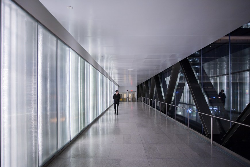 The artwork presents a kinetic volume of light evoking the surface of Lake Ontario in winter.