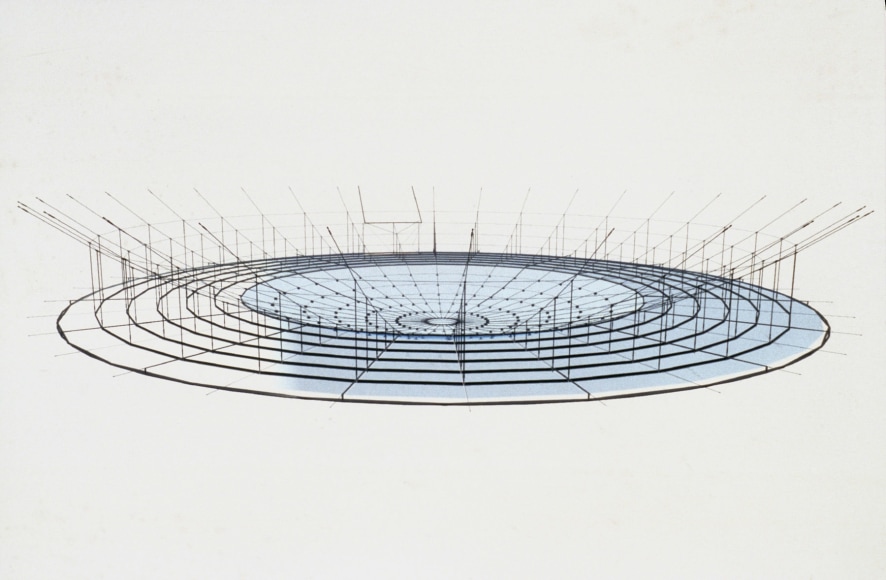 Underscoring the beauty inherent in physical laws, the delicate, suspended cable structure alludes to the interaction of water and light.