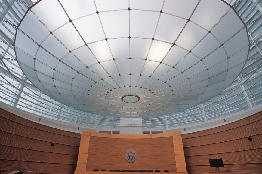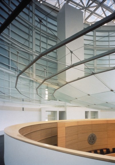 The spherical area of glass is diffused, creating a luminous sculptural element that captures the sky and the shifting shadows of the building’s structure without distracting attention from the proceedings in the courtroom. The various laminated glass panels, provides a thermal, acoustic, and dust barrier for the courtroom space.
