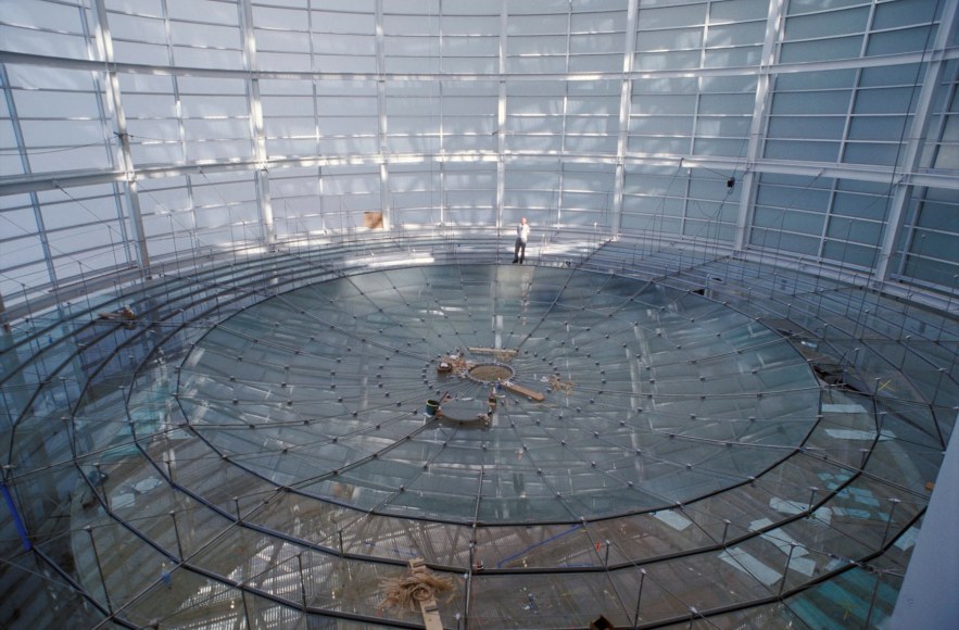 The central lens area acts as a precise diffuser for the artificial lighting mounted at the top of the drum, while the clear horizontal perimeter ring of glass visually frames the lens and allows views of the sky from the public viewing gallery. JCDA also designed an innovative solution for the mandated sprinkler system, fabricating the sprinklers out of stainless steel and integrating them as working members of the cable-net tension structure