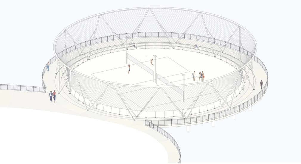 Though unbuilt, JCDA designed a volleyball enclosure using a cable-net system to utilize the benefits of the structure and to highlight the pier’s setting. Its structure and materials evoke the site’s industrial and nautical history while its form suggests an enduring relationship between nature and the man-made environment.