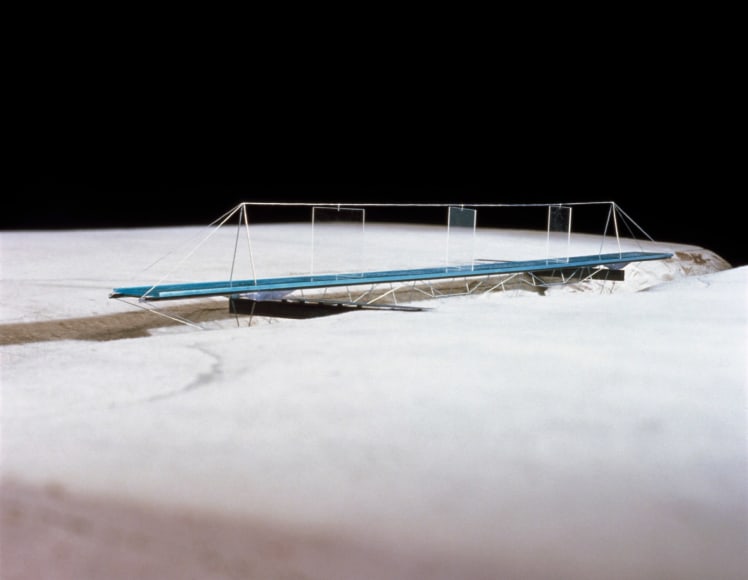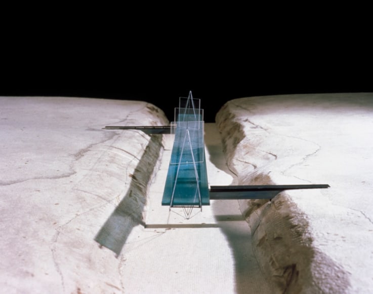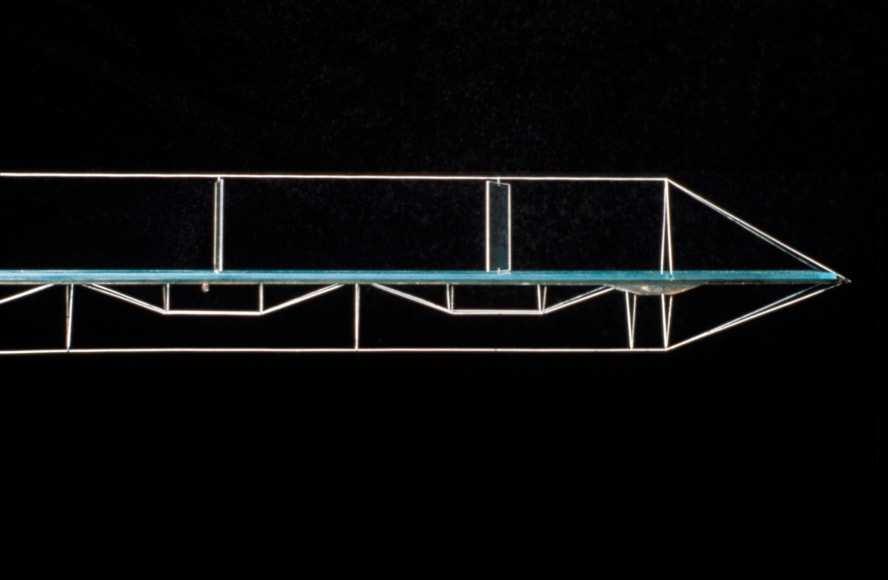 Proceeding out along the abutment, the pedestrian is re-oriented to travel with the river, walking upon its projected image. Positioned along the length of the bridge are three reflective panels of glass that also serve as an integral part of the bridge structure. These panels pivot as one moves along the platform, layering views and light effects that further elucidate the interaction of light, environment and observation.