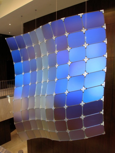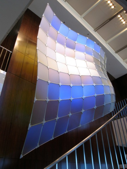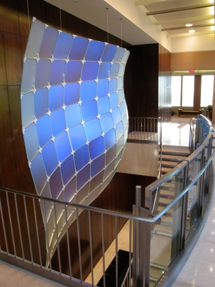 The suspended sculpture marks the entrance lobby of the Bank of America headquarters building in Charlotte, NC. The undulating surface of dichroic glass expresses both the structure and the presence of light within the vertical atrium circulation.