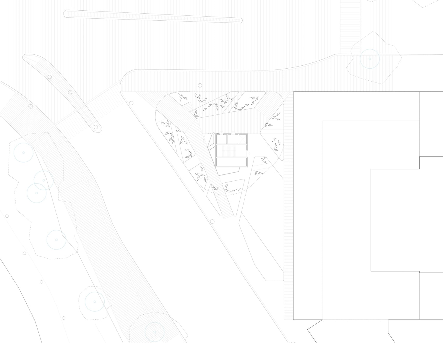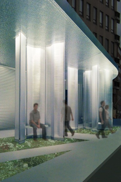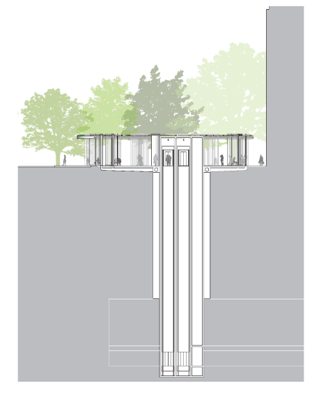 Like a forest grove, this public space provides a variety of micro-environments and micro-climates within its footprint, leveraging the below ground parking and glass elevator core. Groups or the individual passerby can seek public or secluded points within the Luminous Grove, choosing to be exposed to, or protected from, the sun and breezes.