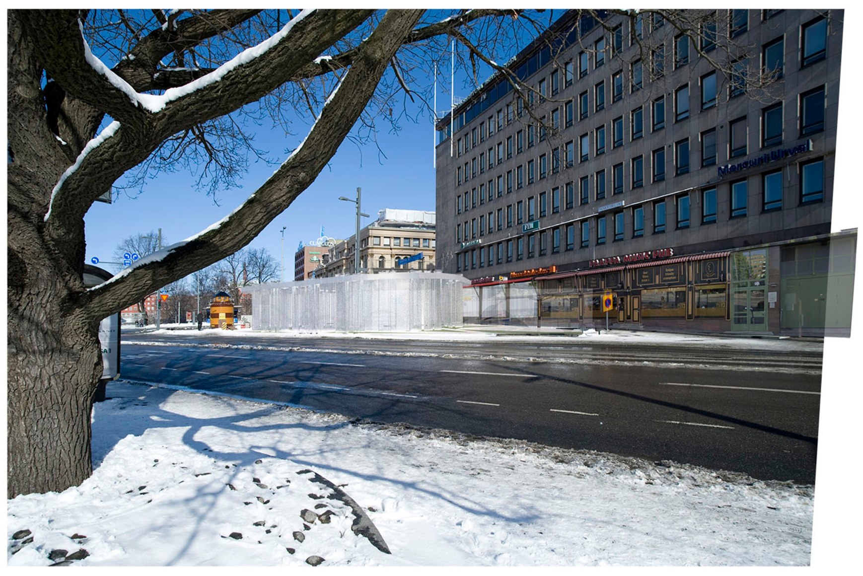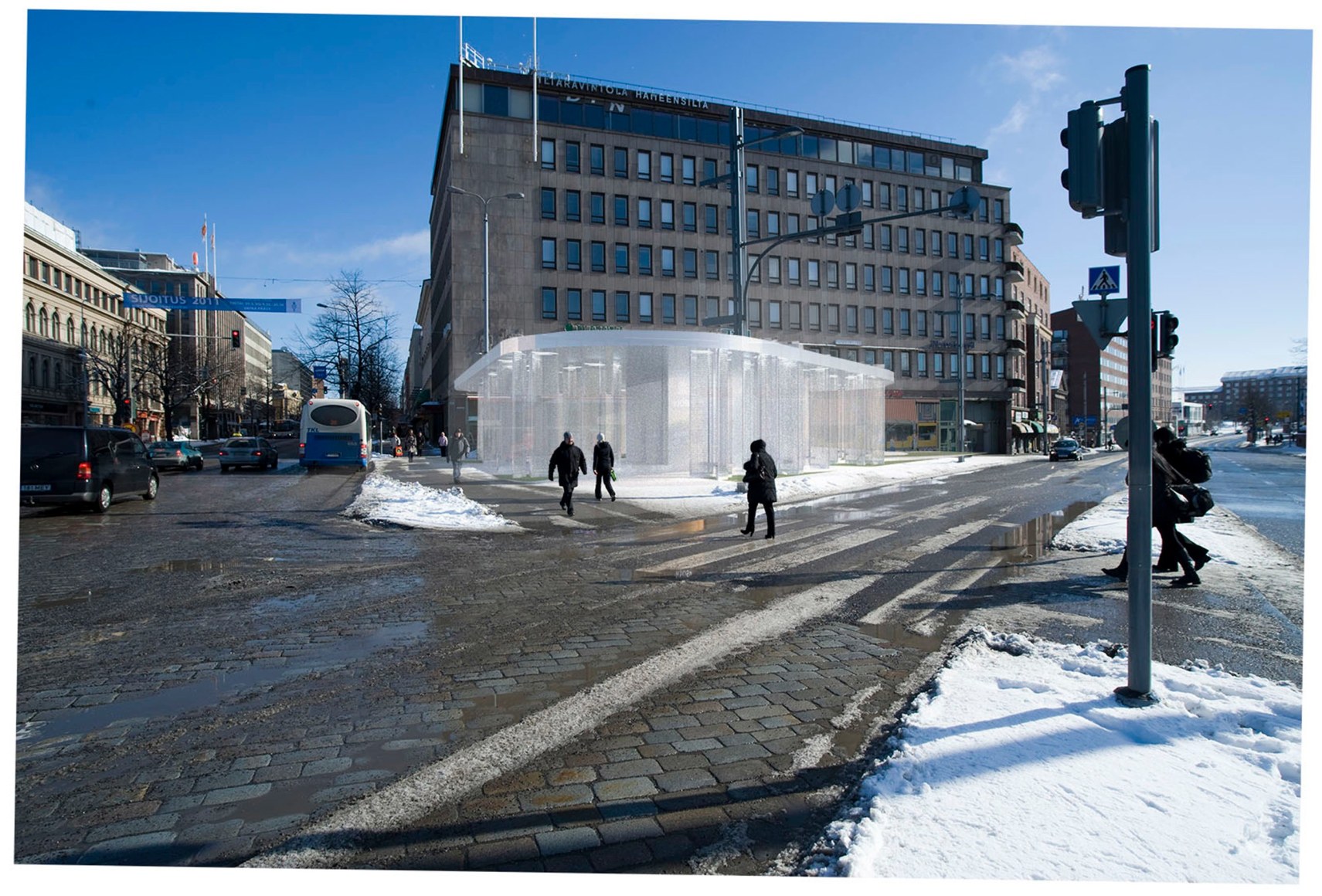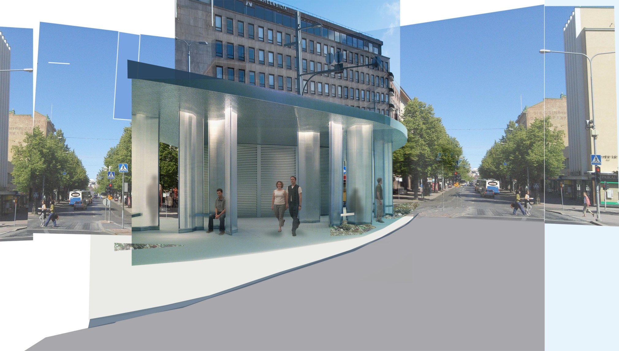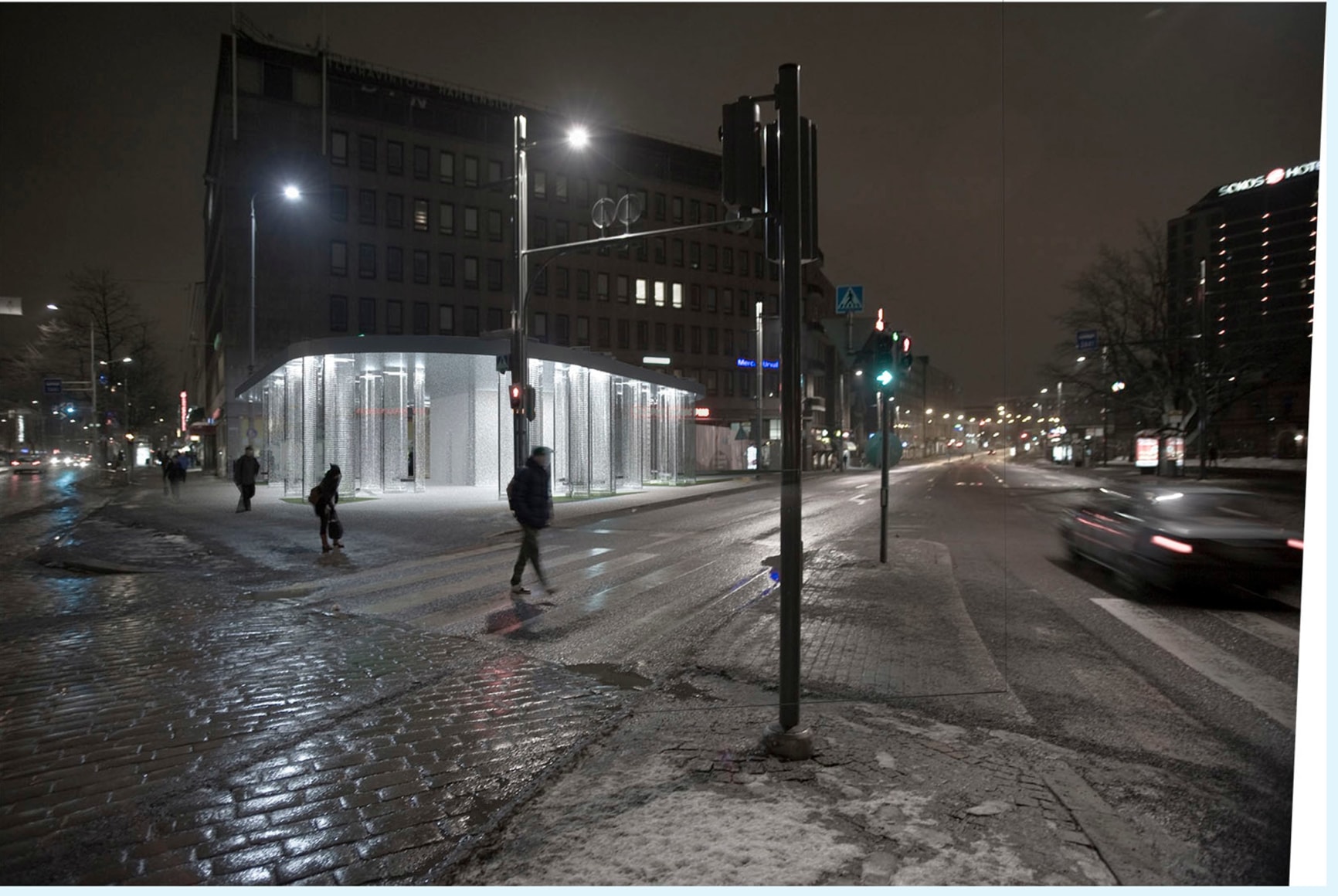 Marking access to underground parking and above ground public transport at Soumen Pankki Plaza, the starting point for the competition was to design a pavilion leveraging the properties of glass and innovative models of glass construction. Our proposed pavilion, the ‘Luminous Grove’ emerges from the open space of the Soumen Pankki Plaza, maintaining and embedding within its layers a sense of the plaza’s open sky and light reflected off the Tammerkoski River. The plaza is colonized by luminous clusters of glass columns and a luminous canopy which collectively form a protected space.