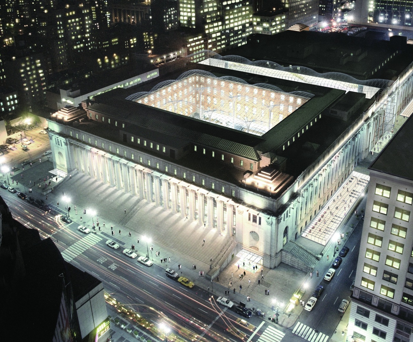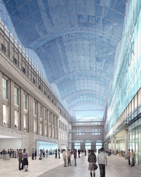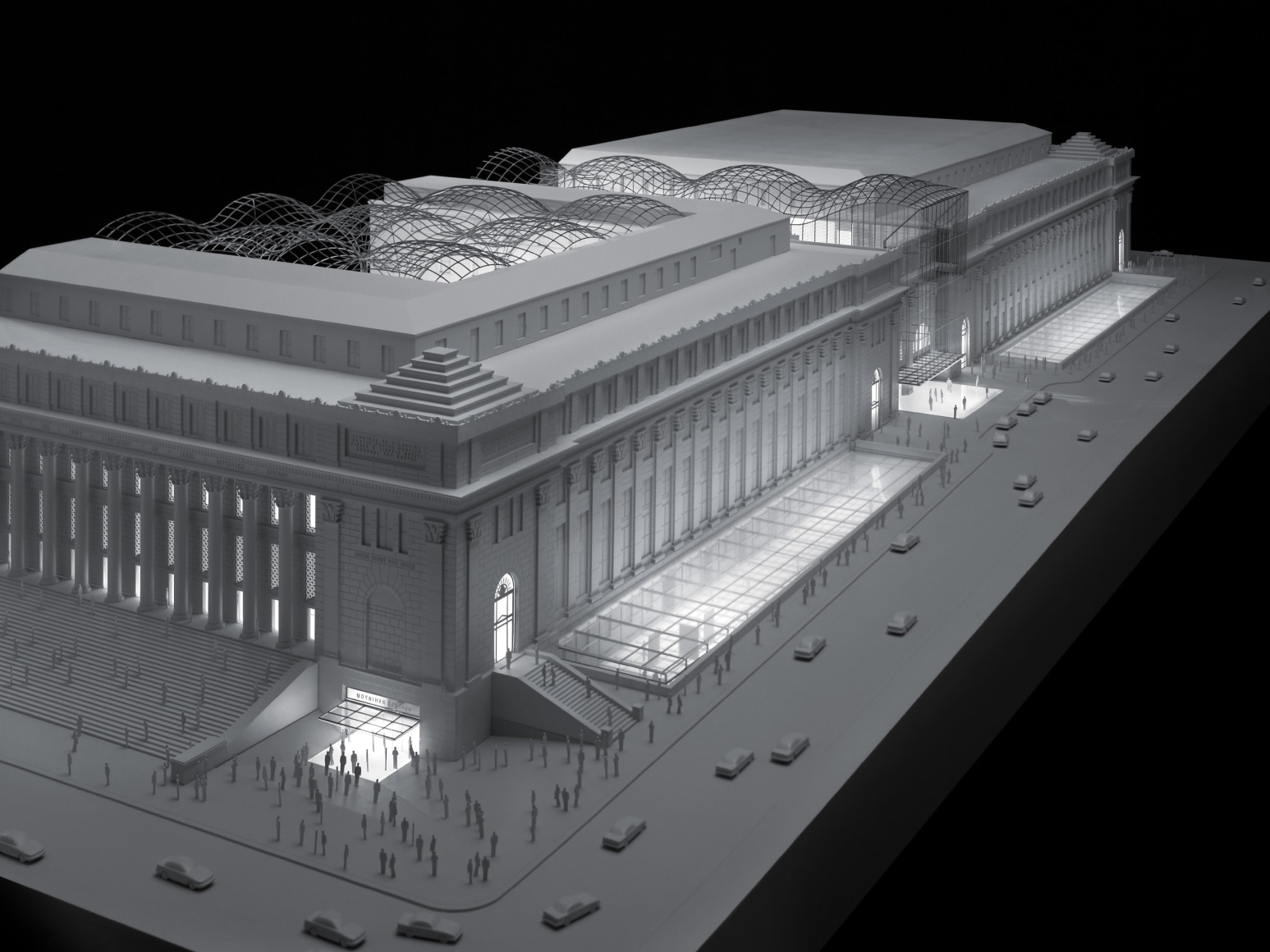 JCDA’s work is focused on the building’s main entrances located North and South mid-block between Eighth and Ninth Avenues, and entry points on the East and West ends of the building, the courtyard’s roof and columns as well as the moats that run the length of the building’s North and South sides. These elements harness the historical significance and neo-classical design of the building by using glass and a minimal gridshell structure to embody light within the building’s large volumes. As in the original Penn Station, daylight reaches the train tracks to emphasize the city’s presence at the moment of arrival and departure.