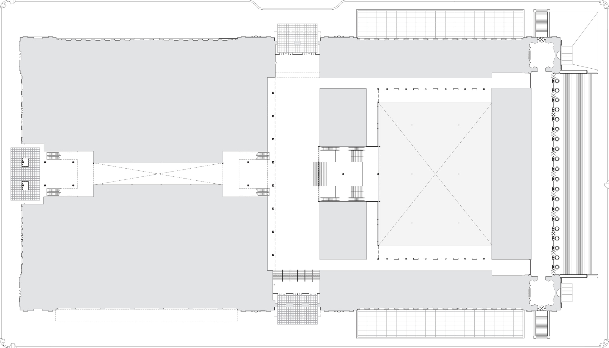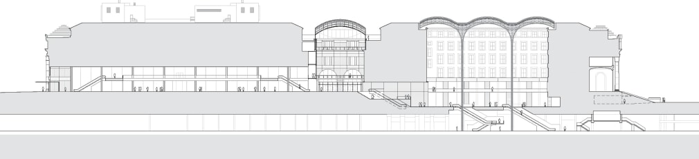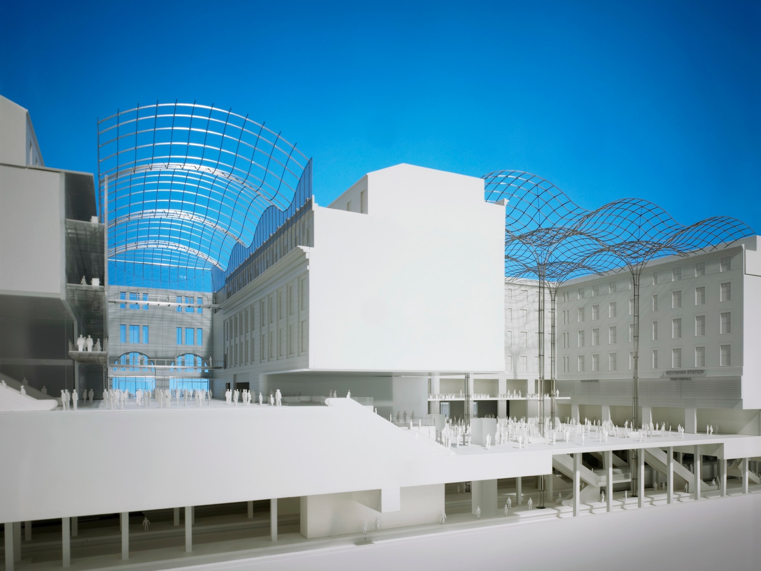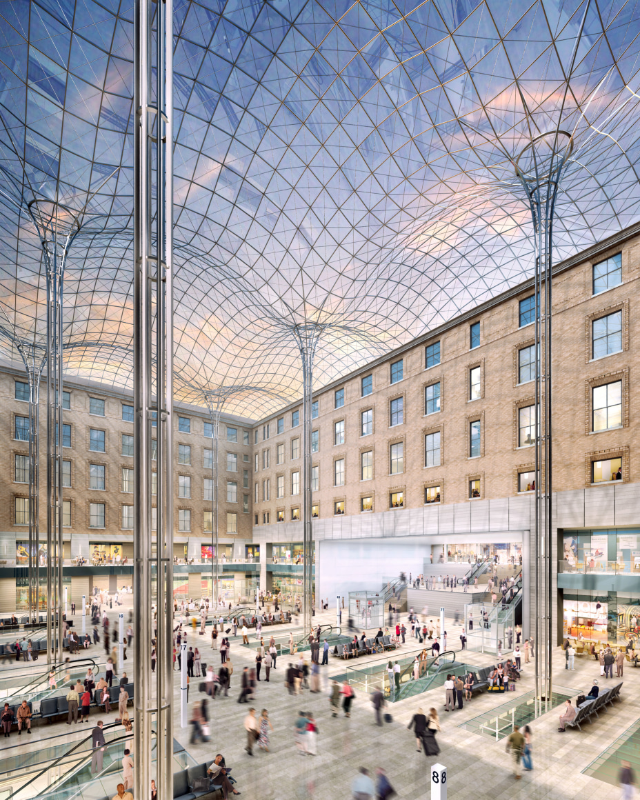 JCDA’s work is focused on the building’s main entrances located North and South mid-block between Eighth and Ninth Avenues, and entry points on the East and West ends of the building, the courtyard’s roof and columns as well as the moats that run the length of the building’s North and South sides. These elements harness the historical significance and neo-classical design of the building by using glass and a minimal gridshell structure to embody light within the building’s large volumes. As in the original Penn Station, daylight reaches the train tracks to emphasize the city’s presence at the moment of arrival and departure.