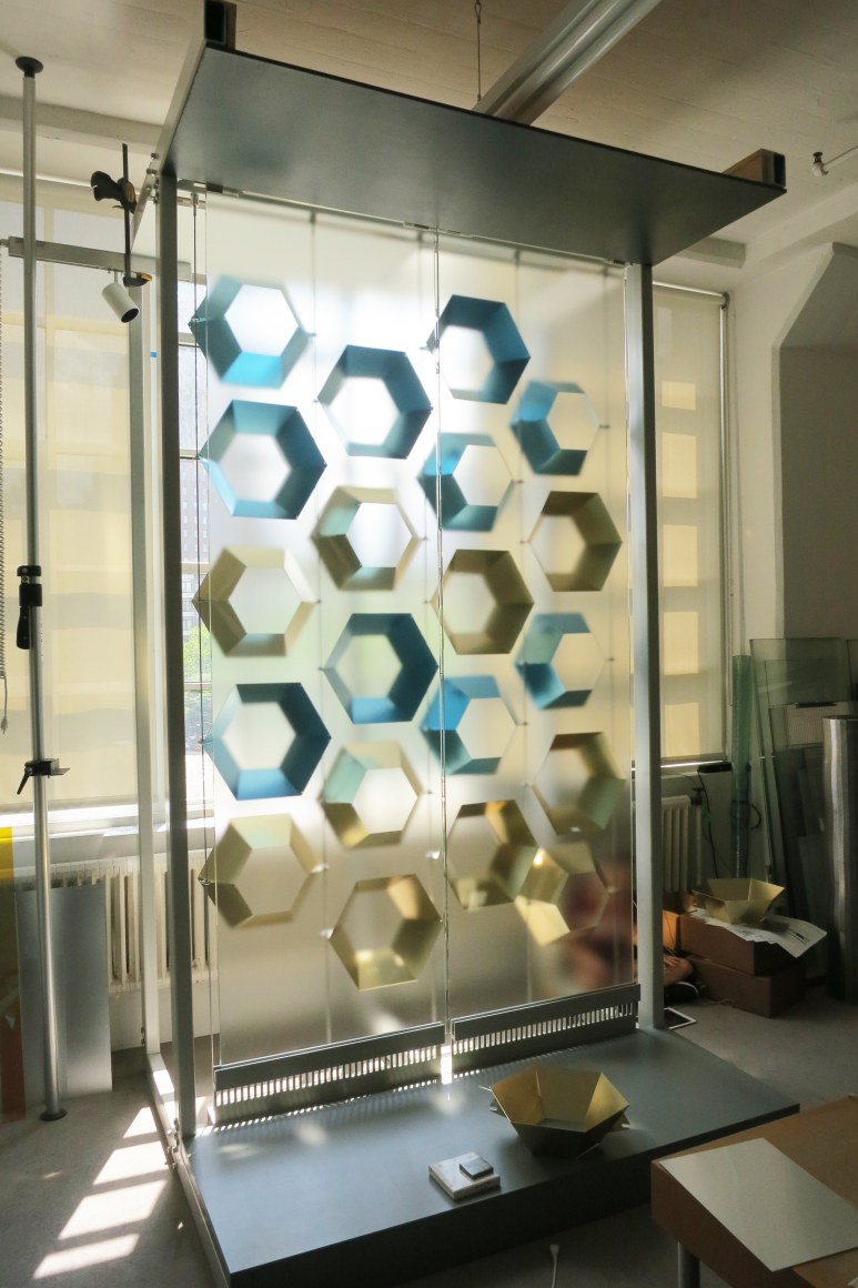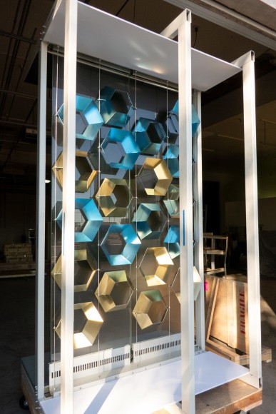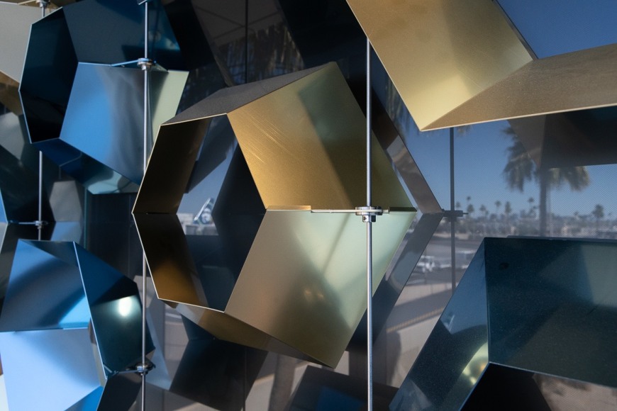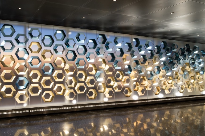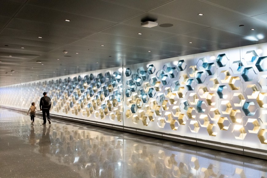 The artwork runs the length of the renovated circulation bridge linking the North Concourse with the newly renovated Terminal 3 and Grand Hall. The luminous volume of the artwork is generated by sun light entering the bridge’s west-facing window wall and interacting with a matrix of suspended gold and blue hexagonal reflectors, the resulting effects captured by a delicately etched plane of glass.