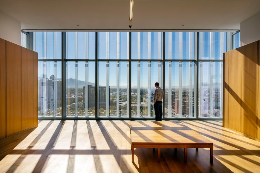 JCDA developed specific shapes and surface treatments for the sunshades which consist of a series of extruded aluminium shapes with selectively milled apertures that respond to the specific solar exposures. These aluminium blades orientation and density and the web’s perforation vary in response to each elevation. Using these profiles as a kit of parts, Thomas Phifer and Partners then designed sunshades of various widths and deployed them across each façade in response to programmatic function. The combination of the sunshades and the glass is developed into a rich tapestry of metal and glass which uses a palette of transparency, reflected light and shadow to embody the Salt Lake City sky.