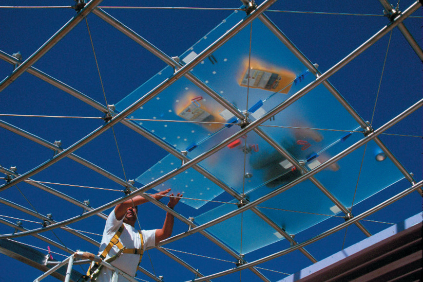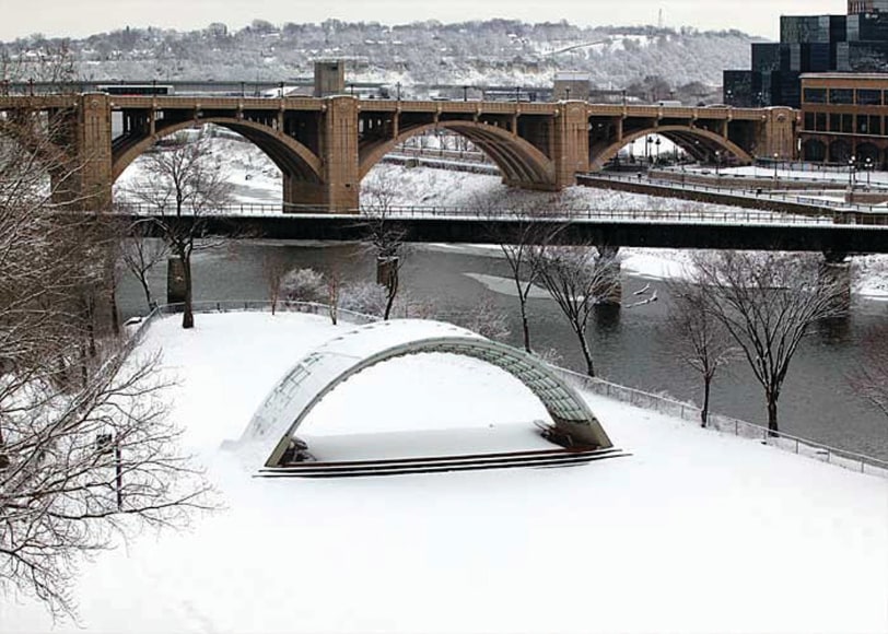 The Schubert Club Band Shell is a robust yet delicate, self-supporting and free-standing sculptural structure of laminated glass. Commissioned by The Schubert Club, the band shell hosts cultural events ranging from chamber music to poetry readings. The anticlastic curvature and laminated glass with an etched interior surface create an acoustic framework for performances.