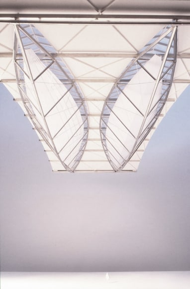 The Sculptural Light Reflectors are suspended within the central bay of the skylit roof beams of the Departures Hall of the new International Terminal at San Francisco International Airport. These three-dimensional roof beams define an inner volume in which the Reflectors modulate natural light from the moment it enters the building, contributing to light and thermal control at the skylight roof level.