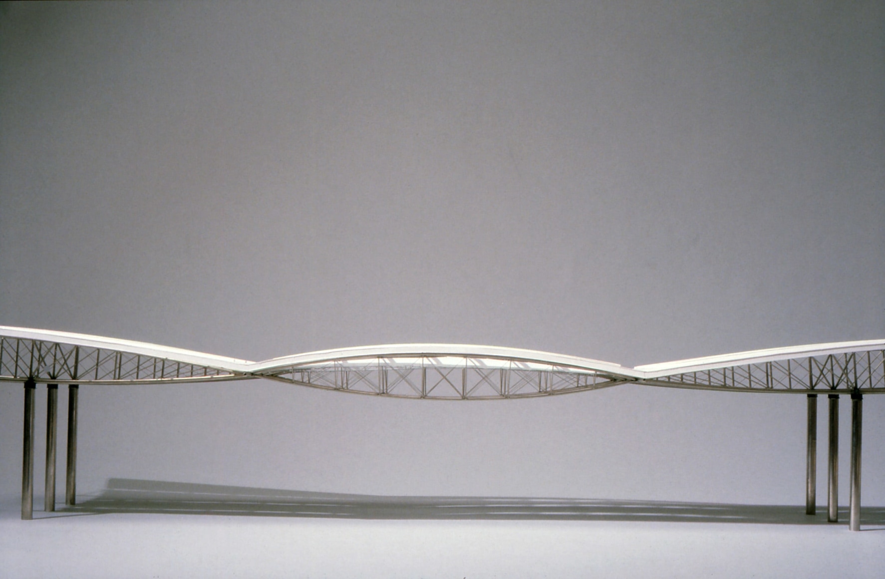 The reflector arches in two directions, creating a double curvature and billowing form to scatter light. The reflector, a lightweight tensile fabric structure, is comprised of a rigid perimeter frame with a coated fiberglass fabric stretched into shape by Kevlar ropes. The perimeter of the reflector is highlighted by a reflective beveled glass corona, which projects a subtle play of light reflection over the course of the day.