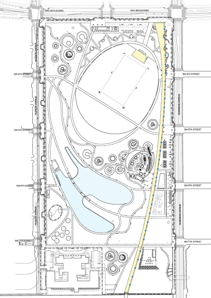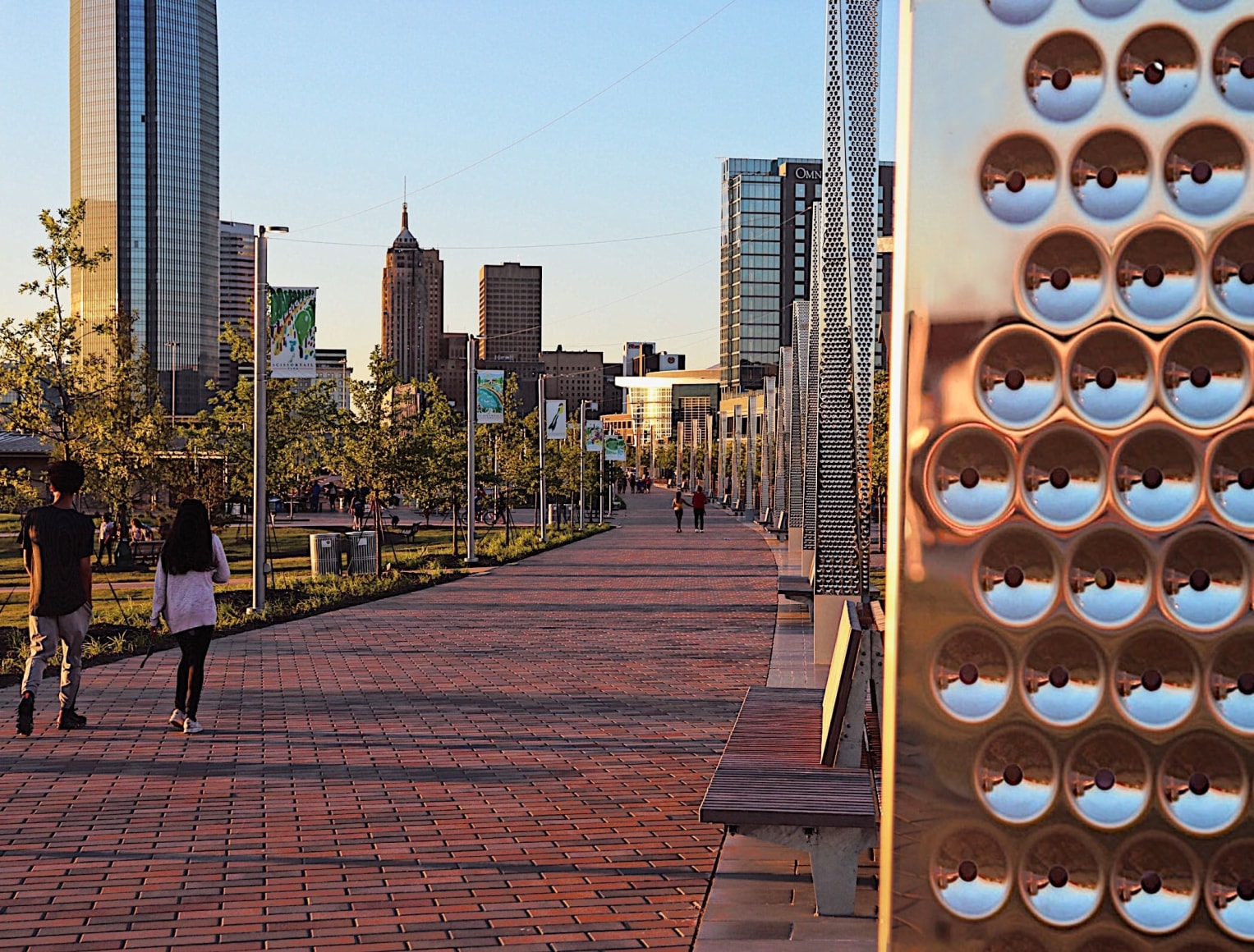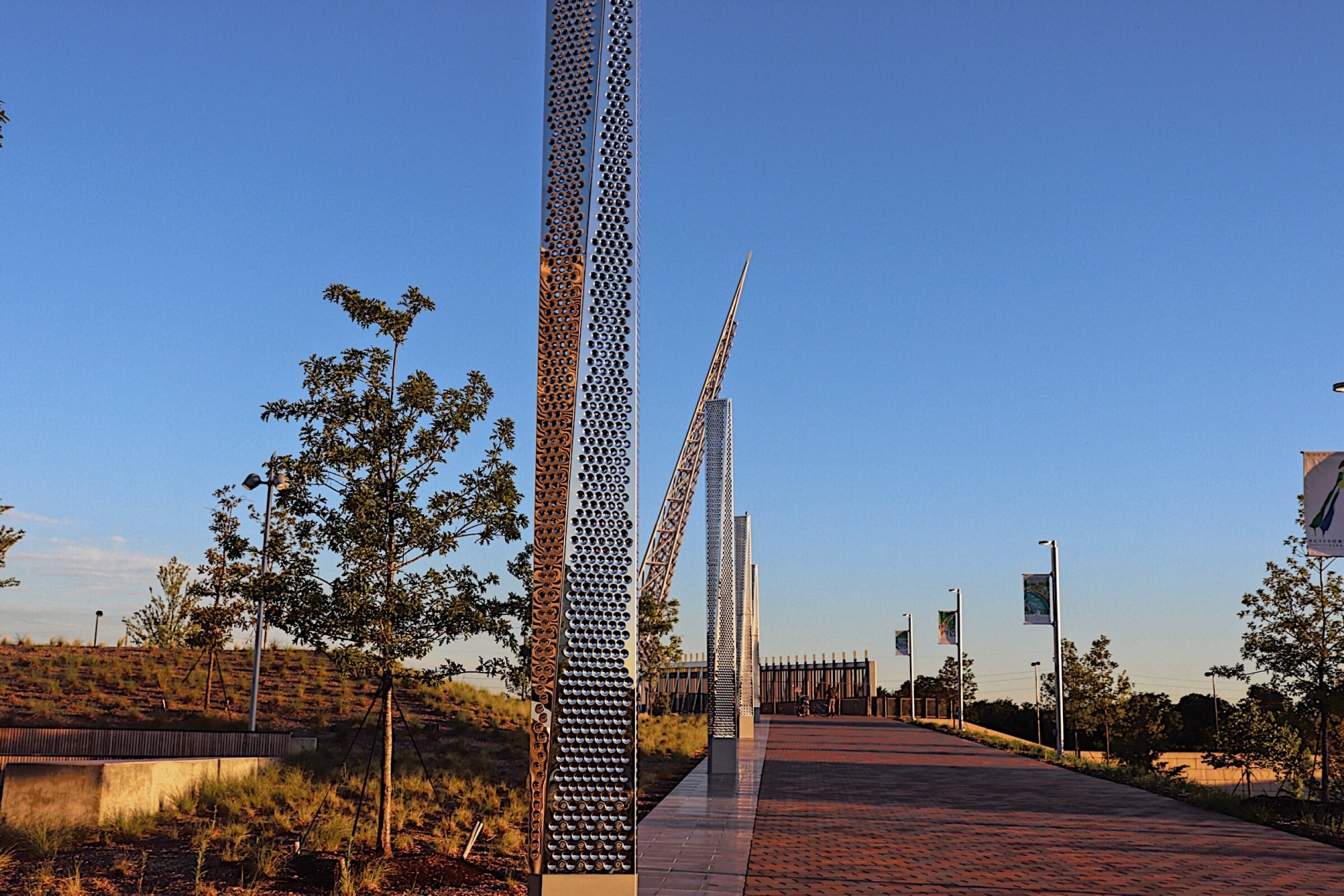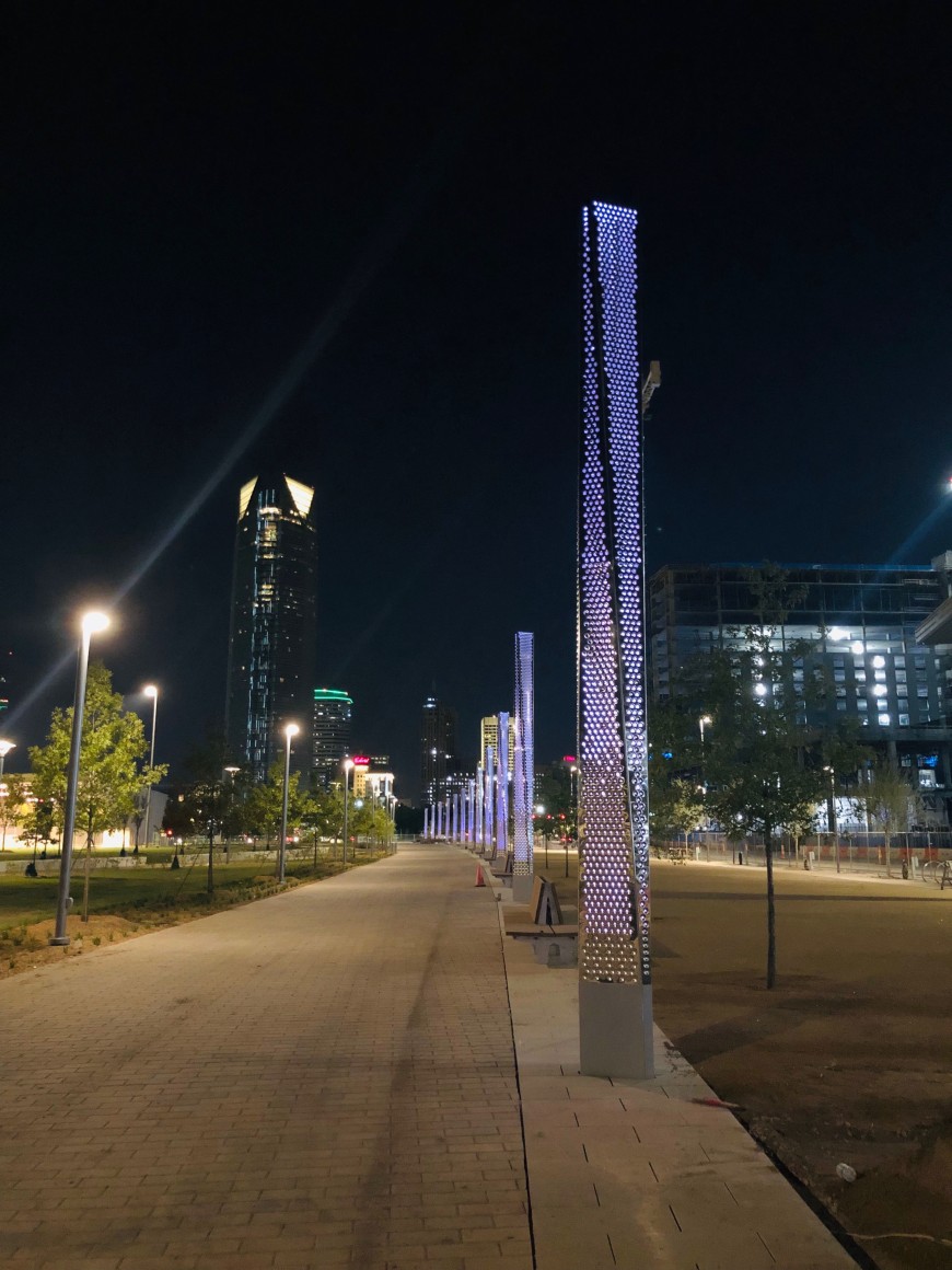 The Sky Pillars are extending to the river in the final phase of the project. When completed, the 67 light masts will be a key wayfinding element that articulates the park’s “core to the shore” concept, connecting downtown Oklahoma City and the Oklahoma River with a ribbon of light.