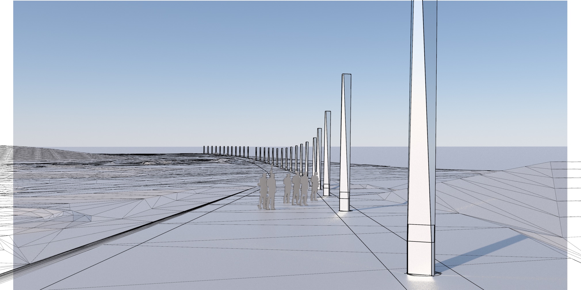 Functioning as a singular choreographed light-event within Oklahoma City's new Scissortail Park’, the 29 folded Sky Pillars are arranged along a key pedestrian path. Each pillar is a 22’ high, embossed and perforated stainless-steel prism with a mirror finish, internally lit at night. Day and night, the efficient structural form and surface treatment of the prisms offer a unique experience of Oklahoma’s expansive skies, emphasizing the arcing line of the park’s circulation axis.