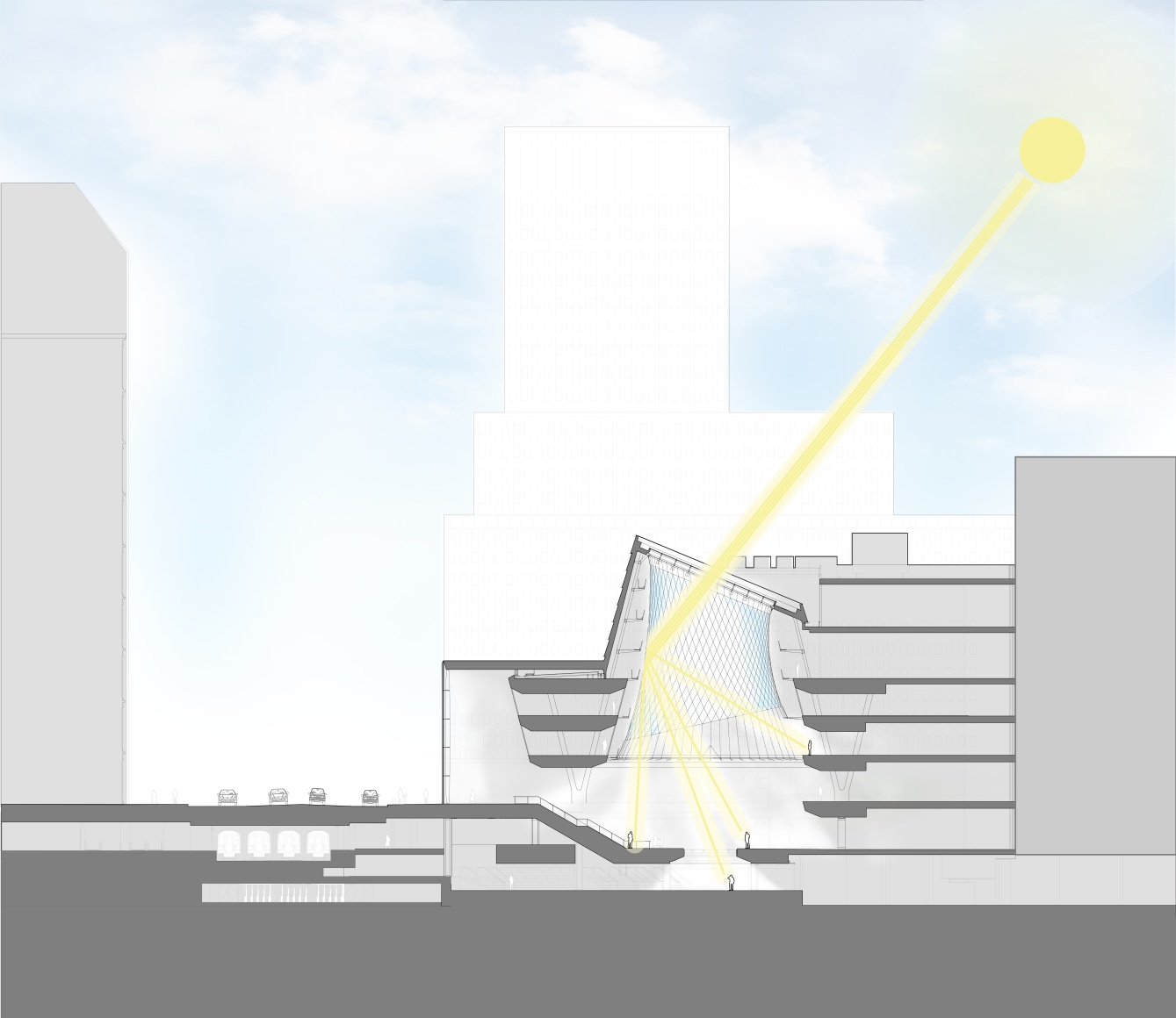 Embedded within the city’s fabric, the Fulton Center’s flow of 300,000 daily users gives the Sky Reflector-Net a defining civic purpose. The integrated artwork creates a temporal connection linking the natural world and urban experience.