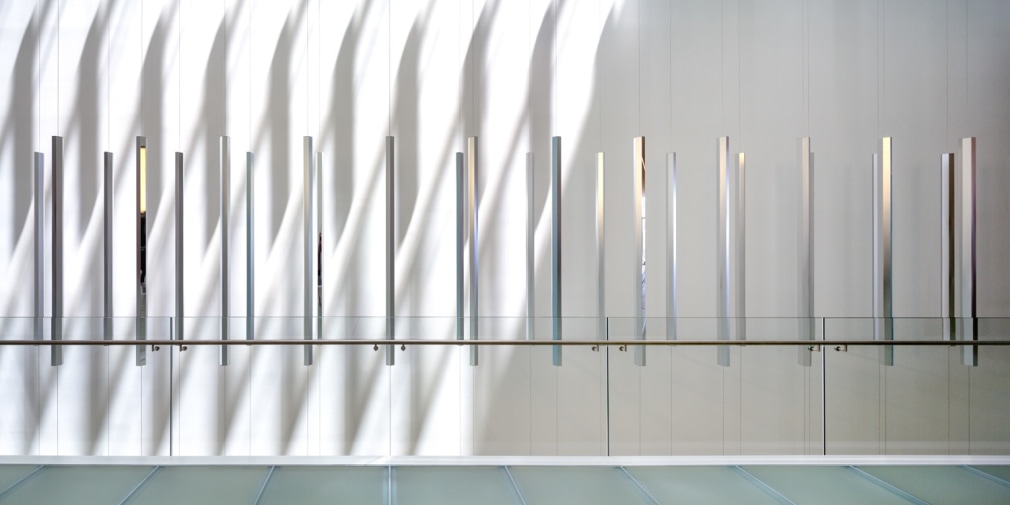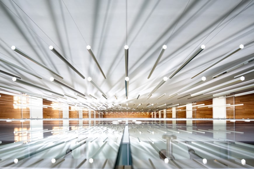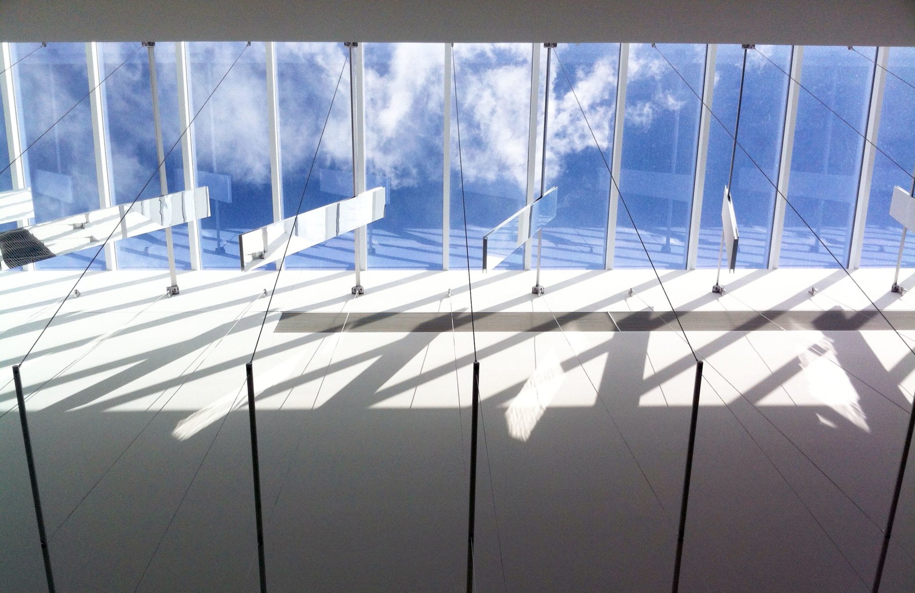 The art work’s 9 stacked fields of hexagonal tubes are, like the cloud borne ice crystals that inspire them, suspended and aligned. They are also intersected by beams of sunlight, projected into their midst by nine tilted mirrors below the skylight. Using reflection to emulate the refraction that occurs in clouds, the Suspended Light Pillars serve to evoke one of Salt Lake City’s signature visual phenomena.