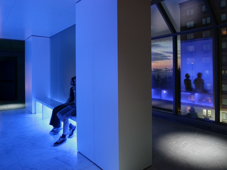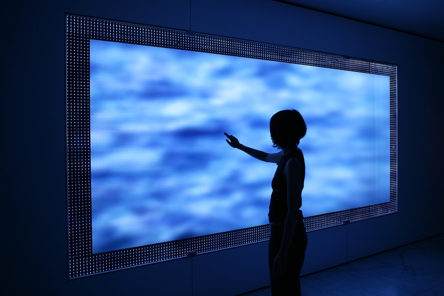 Using a live video feed from the museum’s roof, the play of water and light across the harbor’s surface is transposed to a sparse field of LEDs where the images become flickering points of light. Framing a space of contemplation, this environmental information, reduced to its essence, pure light information, is observed through a plane of glass with a calibrated level of diffusion that resolves the light back into image. A clear frame of glass reveals this tension between ‘light’ and ‘seeing’, ‘nature’ and our ‘consciousness’.