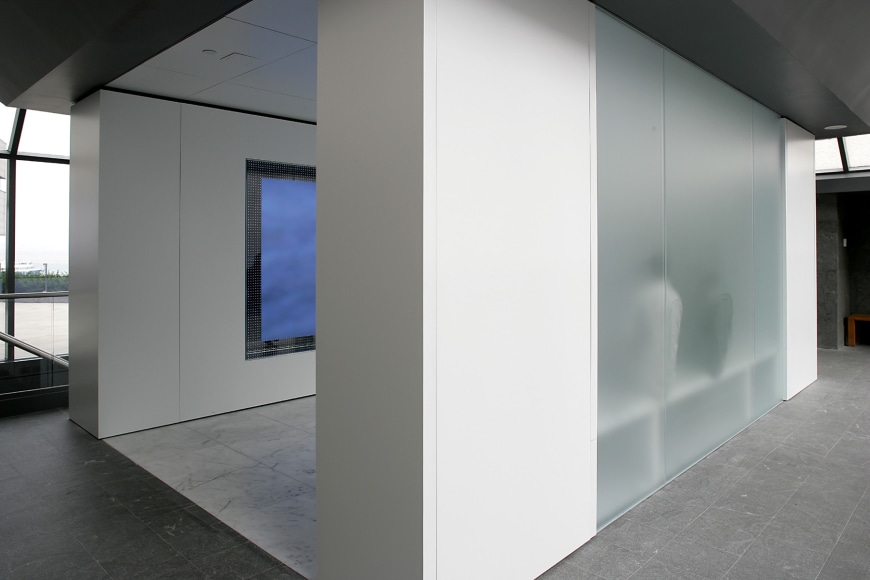 This environmental work establishes a transitional space of rest and contemplation between the permanent collections shown in the original building and the changing exhibitions and events located in the museum’s new extension. This artwork evokes the ephemeral ecology of sky and water complementing the earth-bound qualities of the Andy Goldsworthy sculpture garden below.
